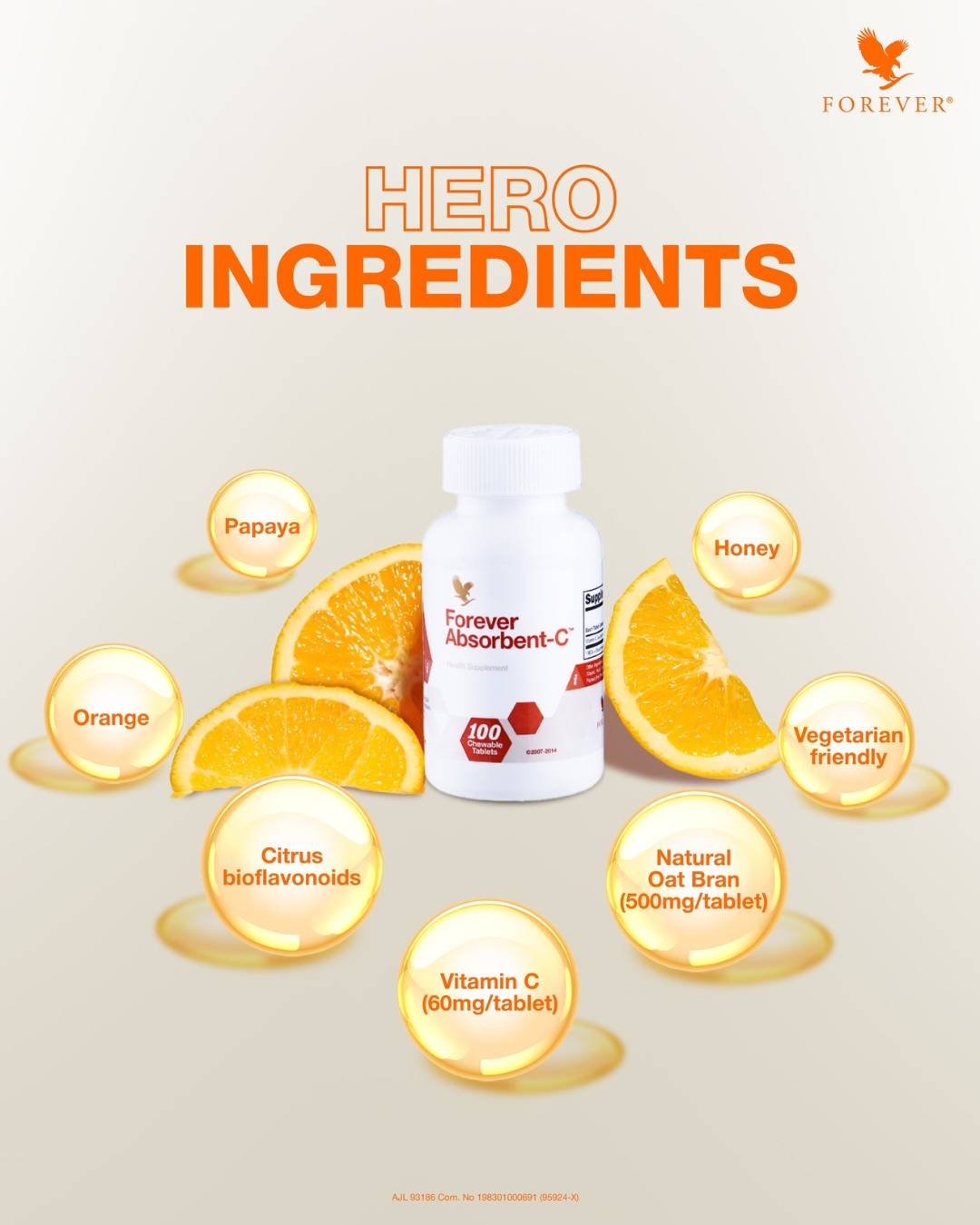 Forever Absorbent-C® provides an easy, delicious and advanced way to supply your body with its daily recommended value of vitamin C. We combined vitamin C with honey and oat bran to pack in plenty of all-season wellness.